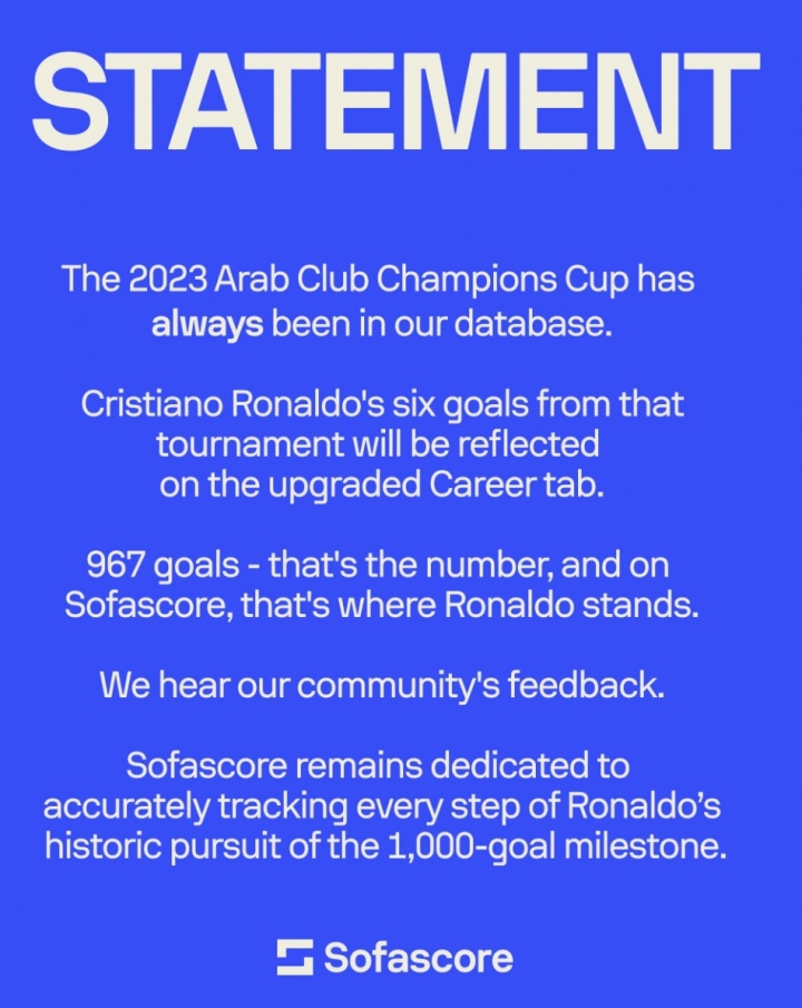 04月10日讯 此前C罗生涯总进球数的争议持续引起讨论,C罗本人也在社媒以评论做了表态。球迷反馈称sofascore找不到C罗阿拉冠的进球,如今sofascore如今发布公告做出回应。